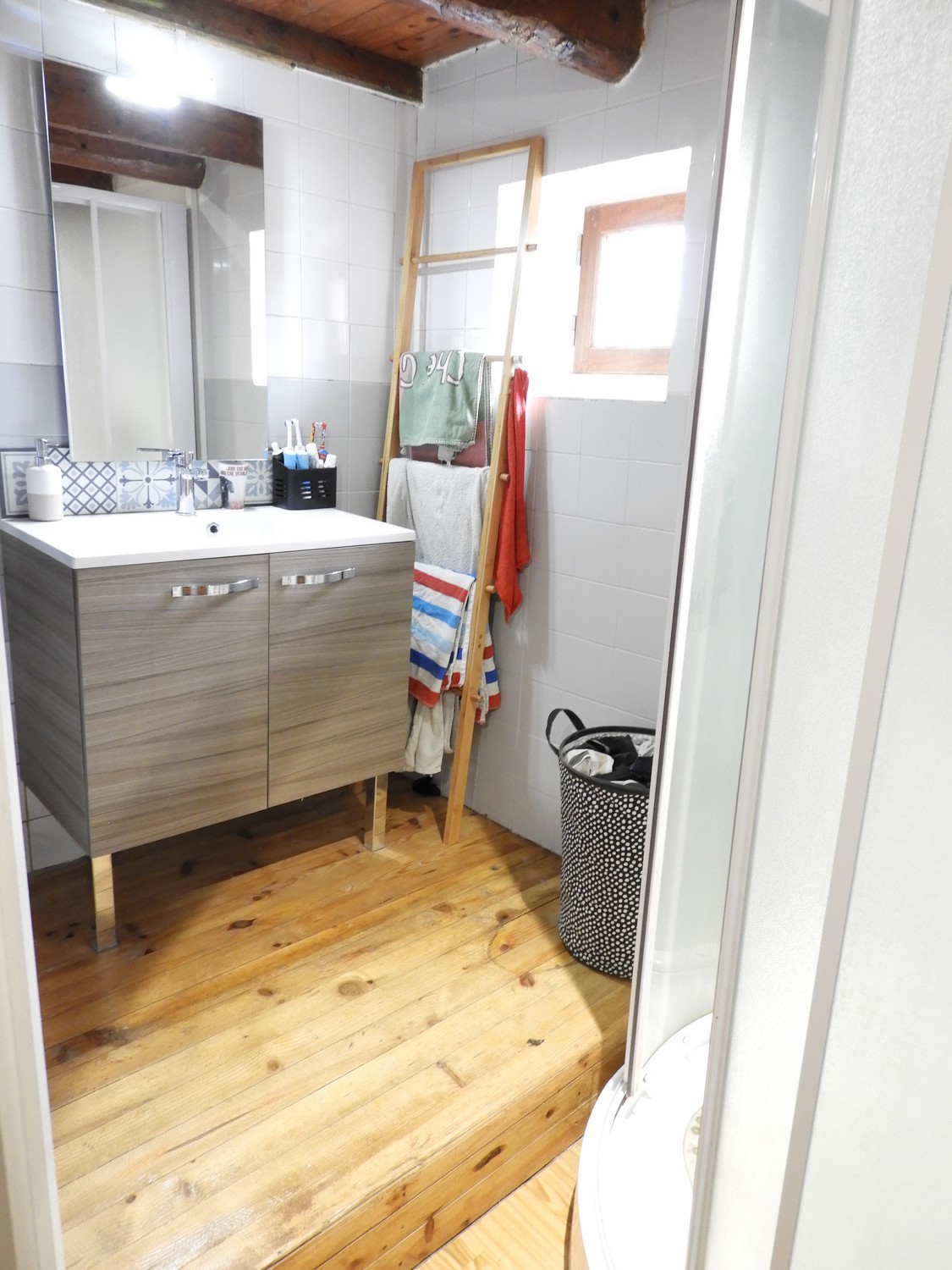 -Salle d’eau avec cabine de douche, meuble vasque, sèche serviettes